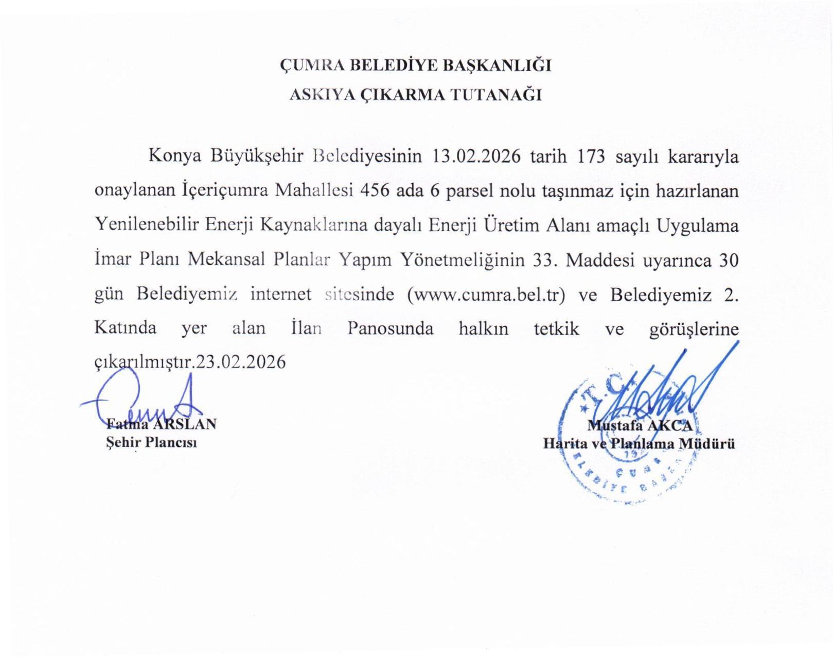 İçeriçumra Mahallesi 456 Ada 6 Parsel Nolu Taşınmaz İçin Hazırlanan Yenilenebilir Enerji Kaynaklarına Dayalı Enerji Üretim Alanı Amaçlı Uygulama İmar Planı